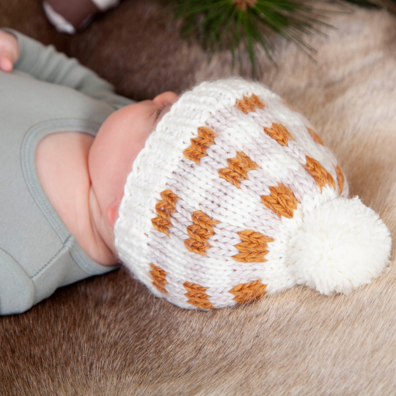 We just love this clever hand-knitted design, a three coloured checked design giving a gorgeous gingham look with a fun pom pom on top.