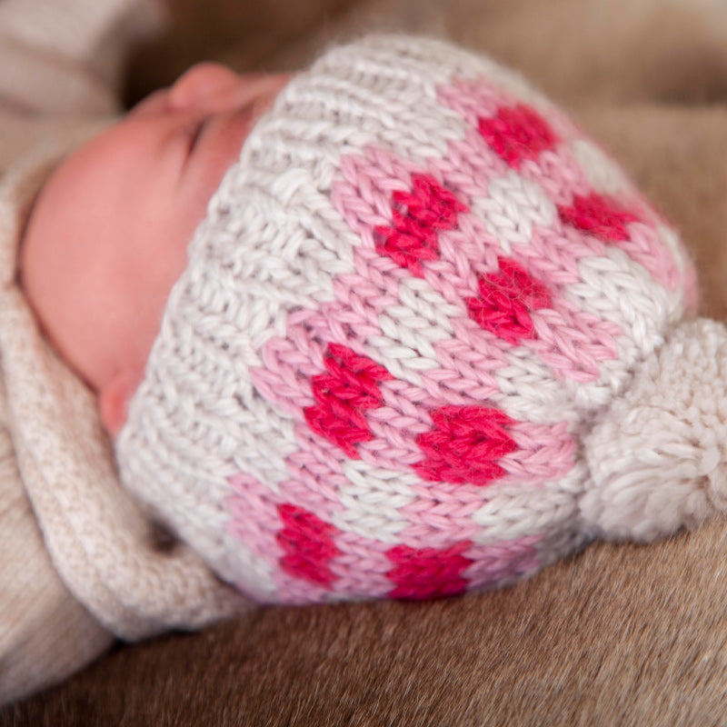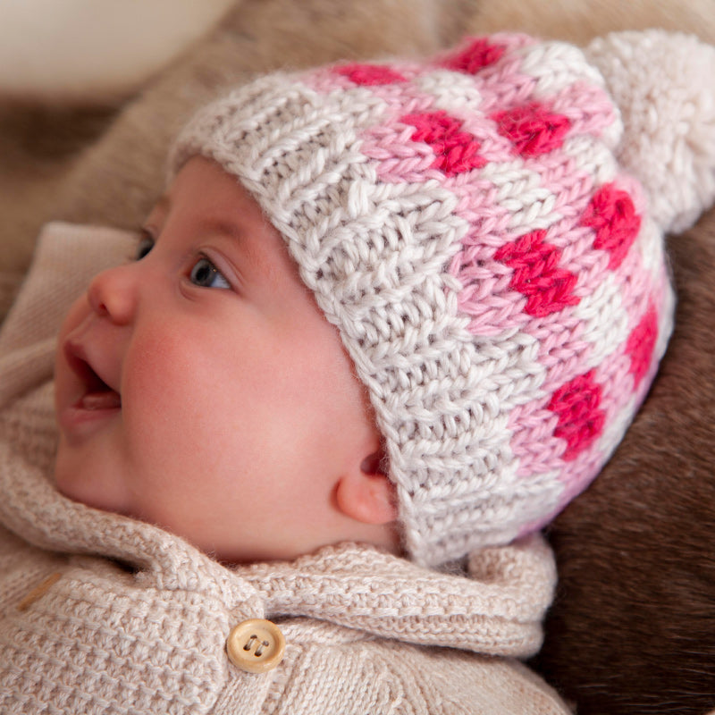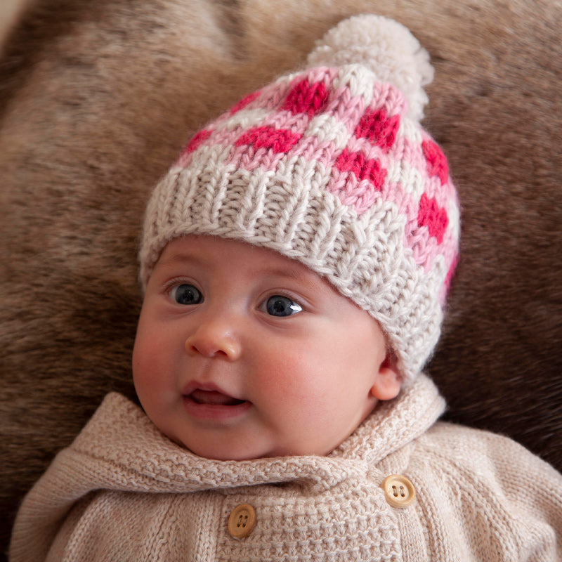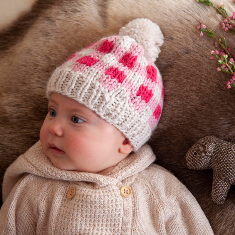 We just love this clever hand-knitted design, a three coloured checked design giving a gorgeous gingham look with a fun pom pom on top.