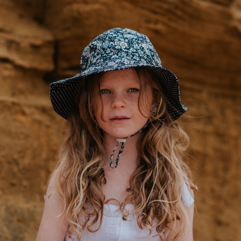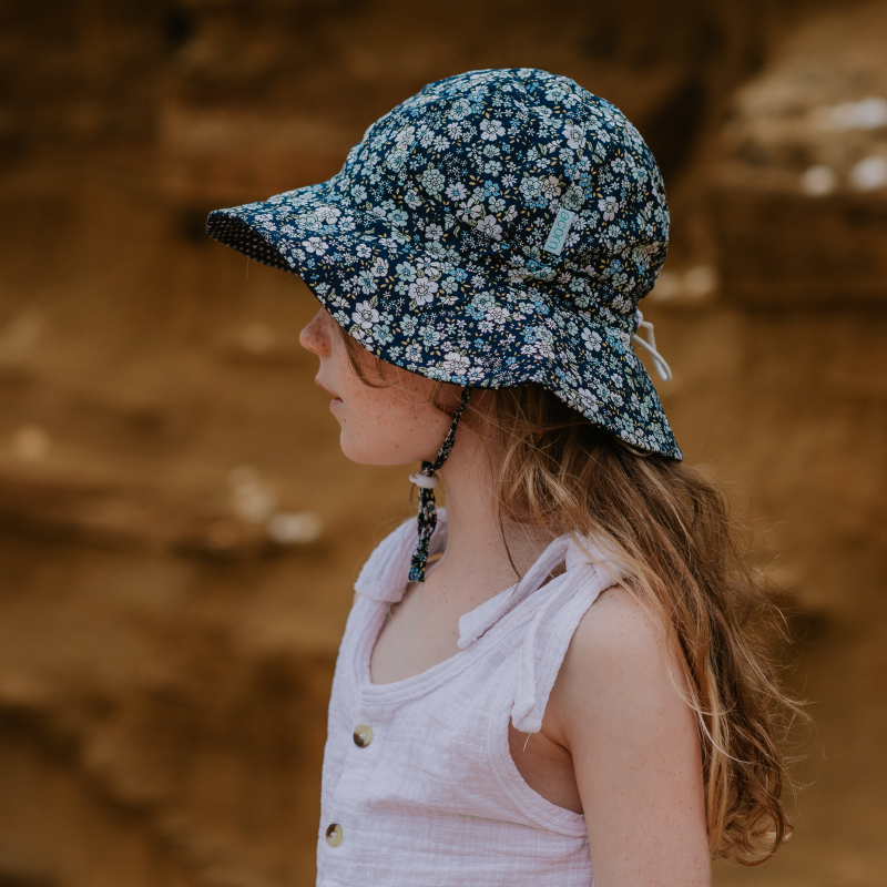 Floppy hat with a beautiful navy floral print on the outside and a navy and white polka dot print in the inner brim.