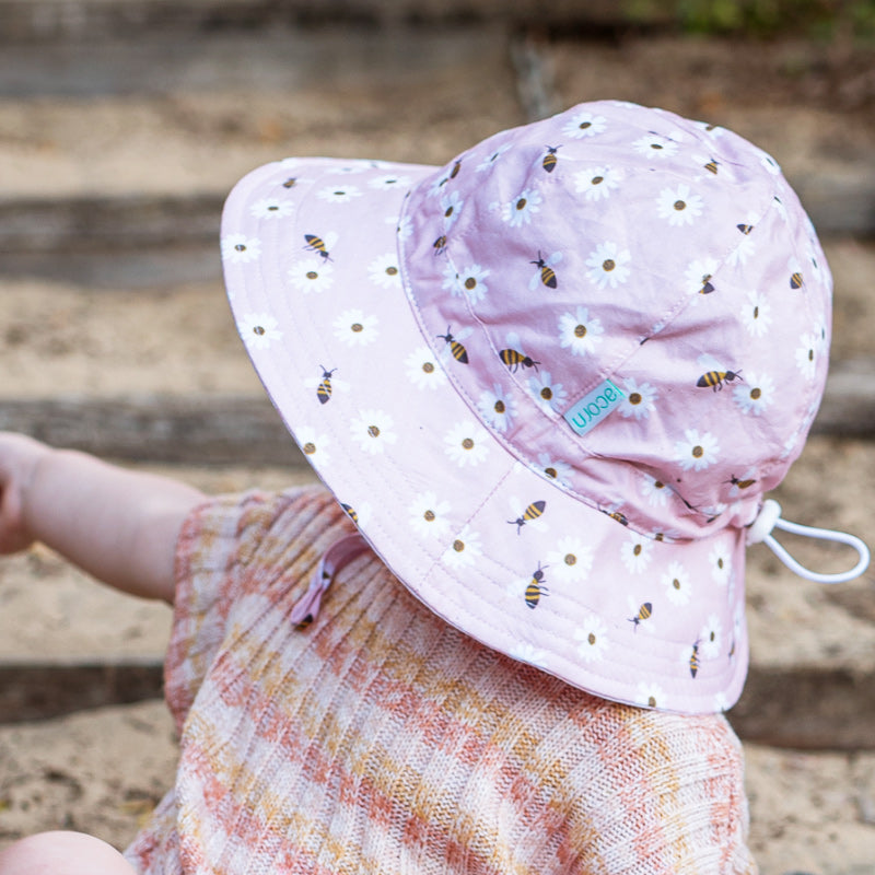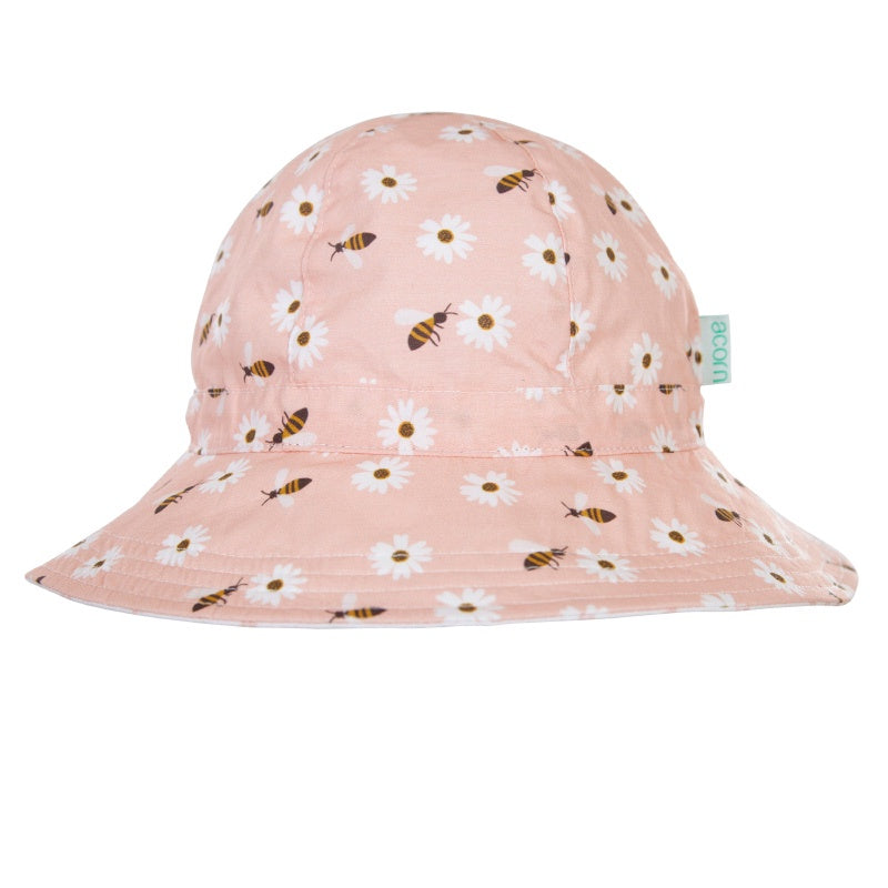 Floppy hat with a daisy and bees print on the outside and a pink and white floral dot print in the inner brim.