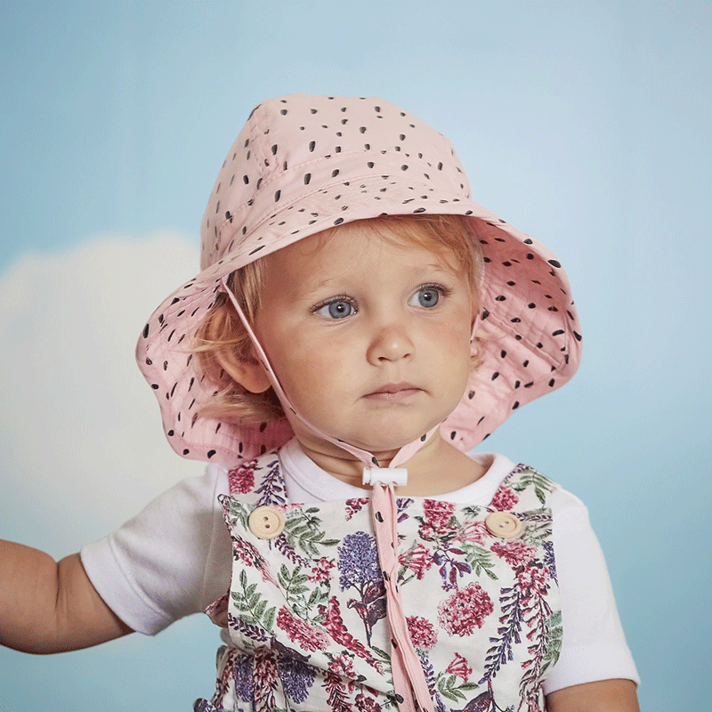 Infant hat with a wide brim and a dusty pink with black dashes print.