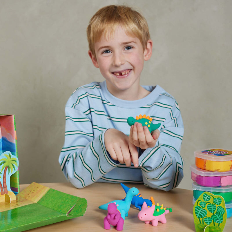 • Includes: 8 colours (160g) of air-drying clay to make 6 dinos, 1 sculpting tool, 2 pop-out accessory sheets, built-in play scene, visual instructions