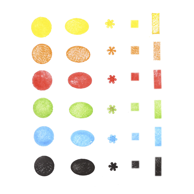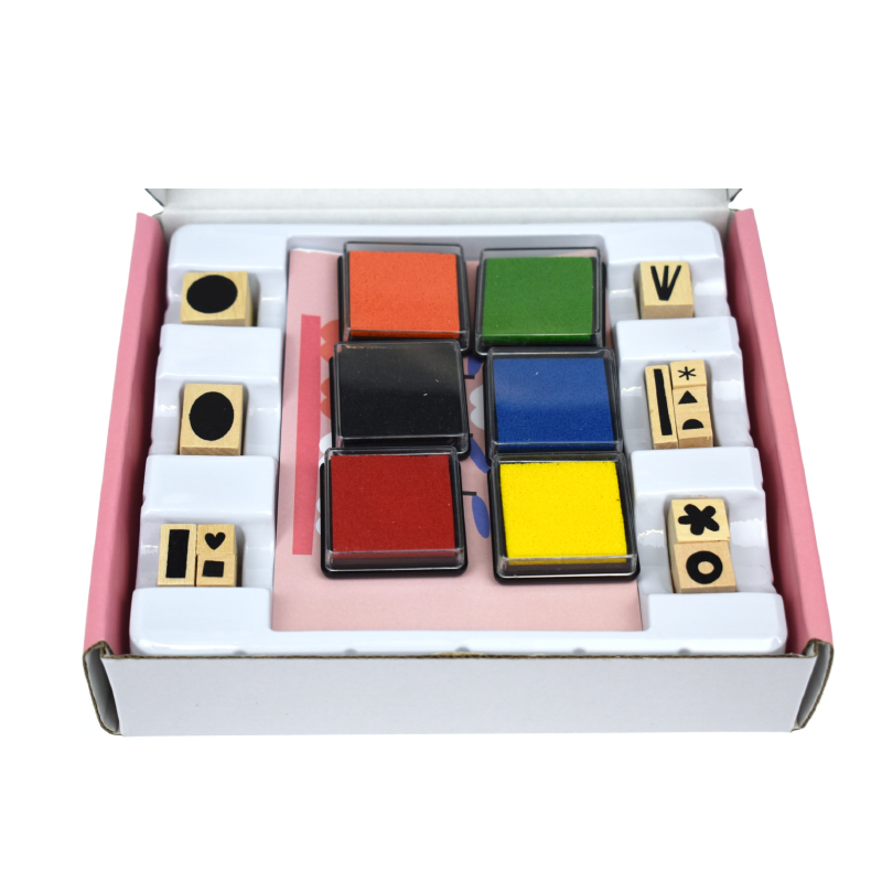 Comprehensive stamp art set with shape stamps, 6 different coloured ink pads and papers.