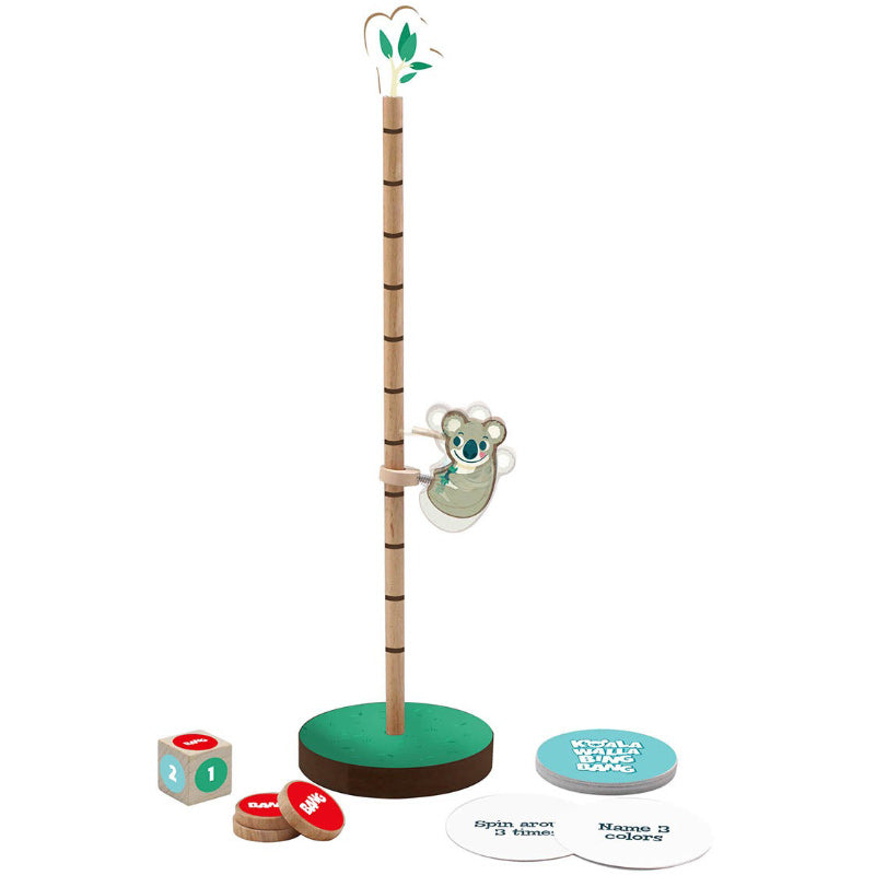 Includes 1 wooden koala, 1 eucalyptus tree pole with base, 1 jumbo wooden die, 25 playing cards, 3 wooden bang pieces and instructions.