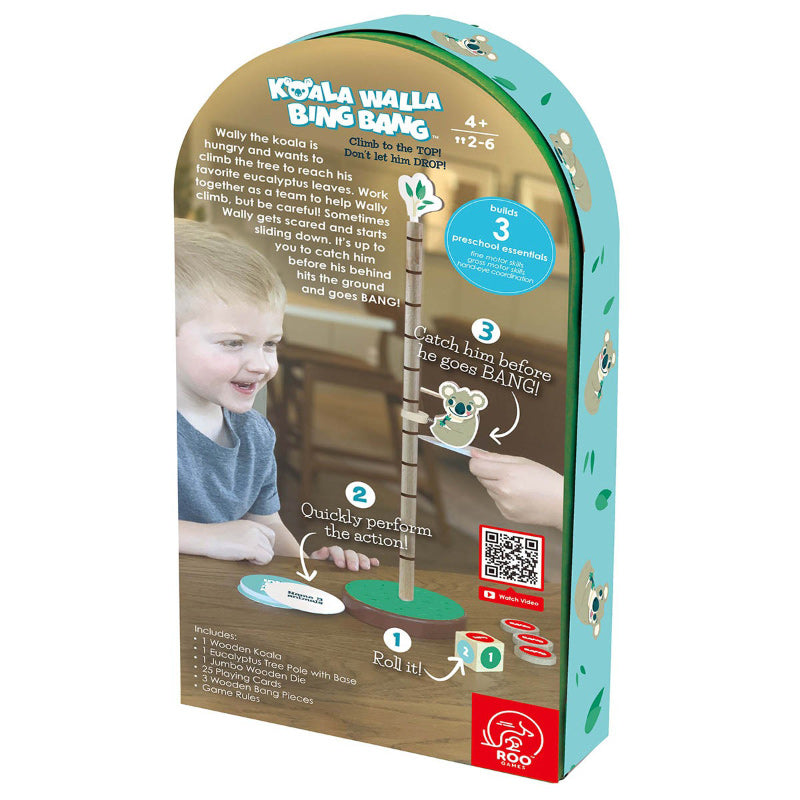 Climb to the top and don’t let him drop! Work together as a team to help Wally climb but be careful! Sometimes Wally gets scared and starts sliding down. It’s up to you to catch him before his behind hits the ground and goes bing bang! Roll the dice, pick an action card and perform it before Koala Walla hits the ground.