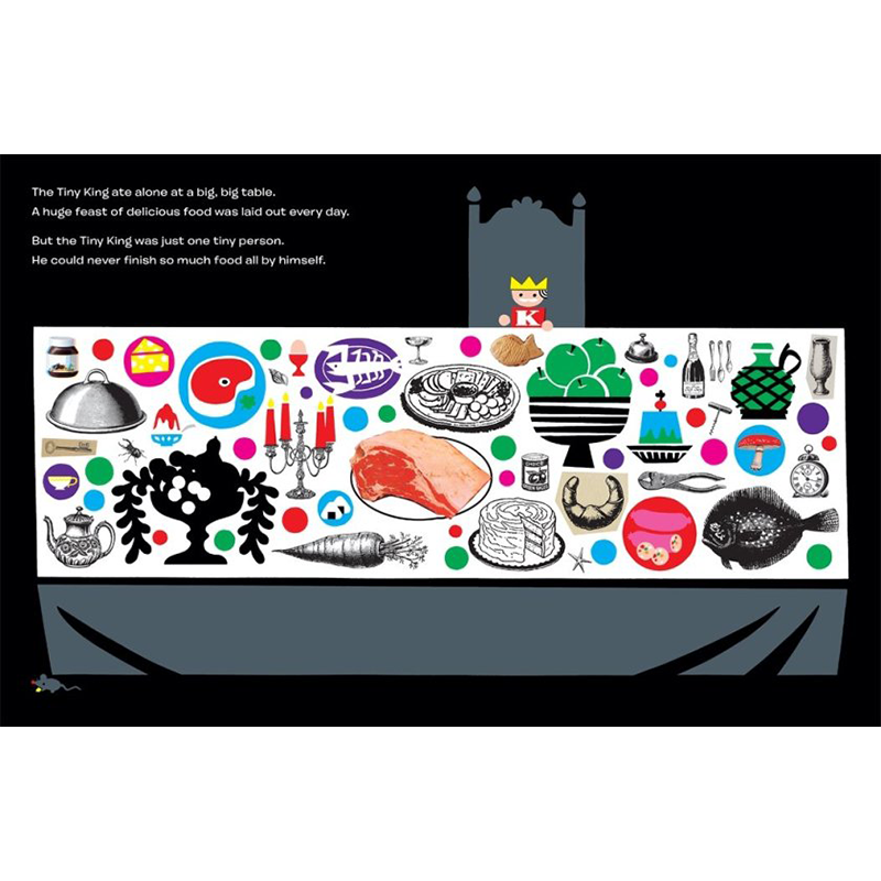 Once upon a time there was a tiny king who lived in a big castle guarded by lots of big soldiers. Every day the Tiny King eats an enormous feast at his big dining table, he rides on his big horse, bathes in his big bath, and sleeps, not very well, in his big bed all alone. One day he meets a big princess and asks her to be his queen. Not long after, they are blessed with children - lots of children Now everything is just the right size.