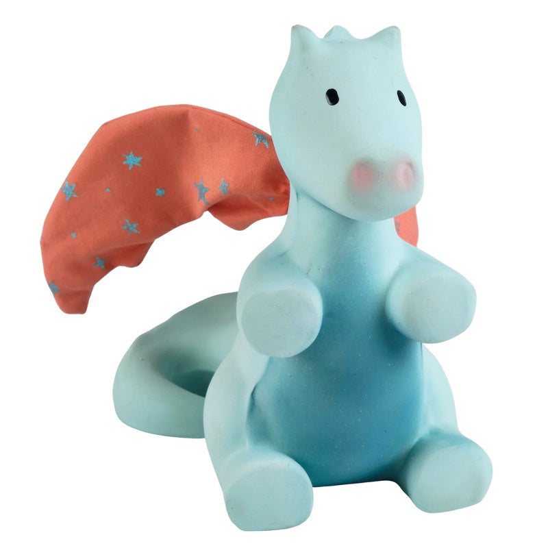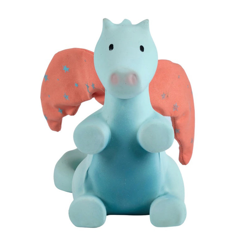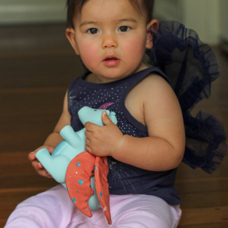 This sweet sunrise dragon has soft crinkly wings for sensory development and soft natural rubber for chewing. A great little friend to comfort a teething baby.