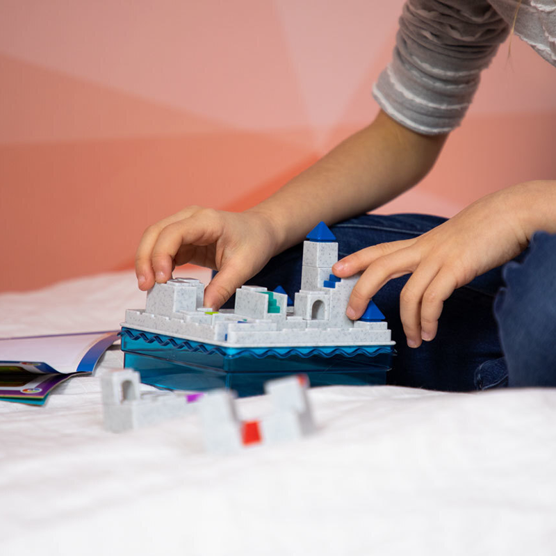 Gameboard, high tower, 5 puzzle pieces with stairways, bridges and tunnels, blue transparent lid, challenge booklet with 60 challenges and solutions.