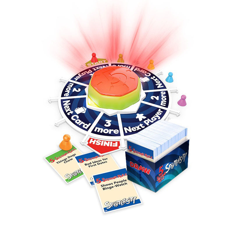 It’s an all-new, spinfully intense version of 5 Second Rule! Like in the original game, you gotta name 3 things, but you’ve got more time now … maybe! The new random timer is going, going, and you never know when it will stop! Hurry to name three things, then spin to see what you have to do next: name MORE things, draw another card, or pass to the next player! You can even combine this with the original game for even more fun!