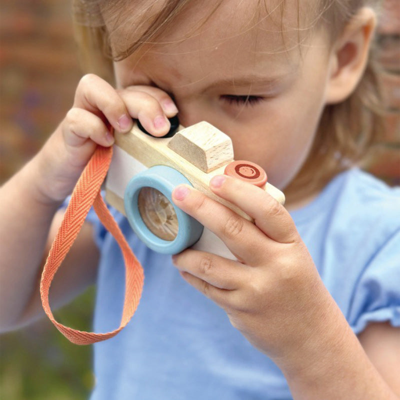 Capture endless adventures with this pretend wooden camera toy. Little ones can snap away with a squishy button and explore the world through the magical kaleidoscope lens. Let the imaginative storytelling and role play begin.