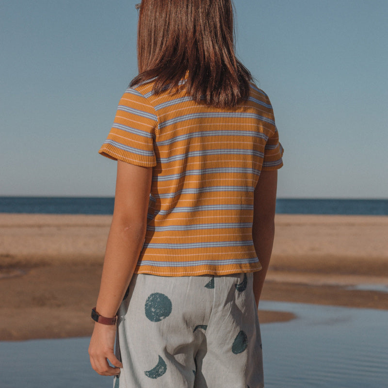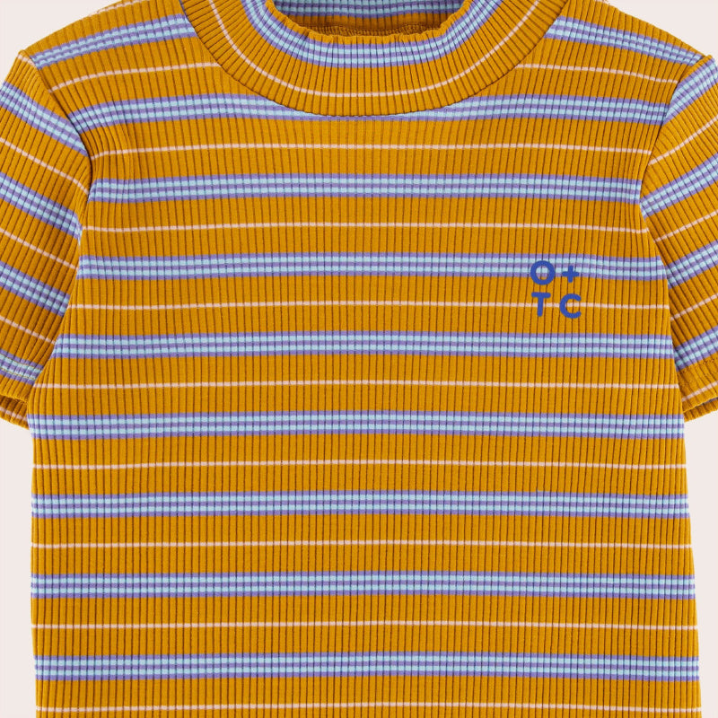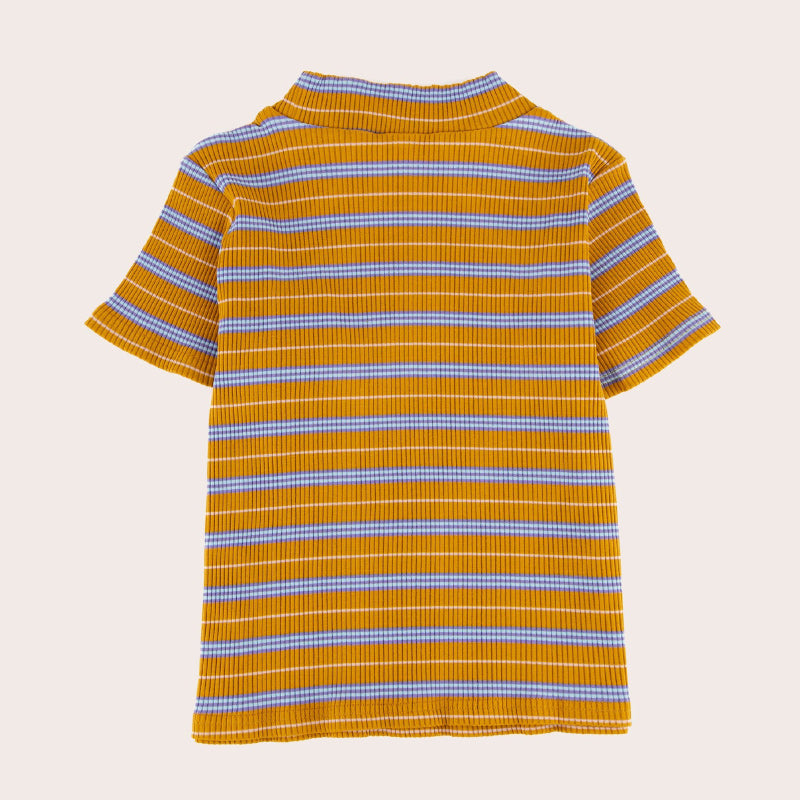 An everyday short sleeve with a cute mock neck, in a stripe that reminds us millennial babes of all the best days growing up.