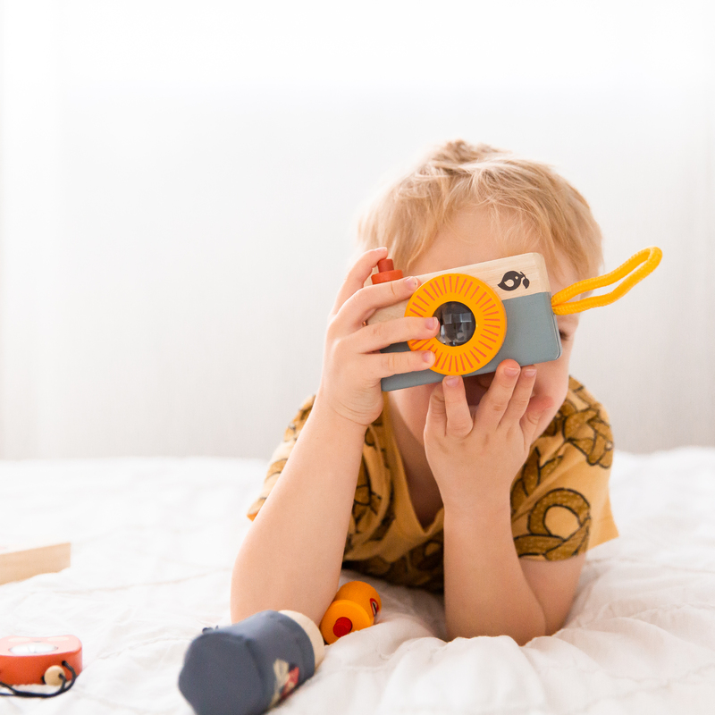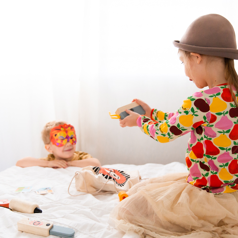 This adorable wooden set is all your little one needs for their adventure. Inside the printed drawstring bag you will find;