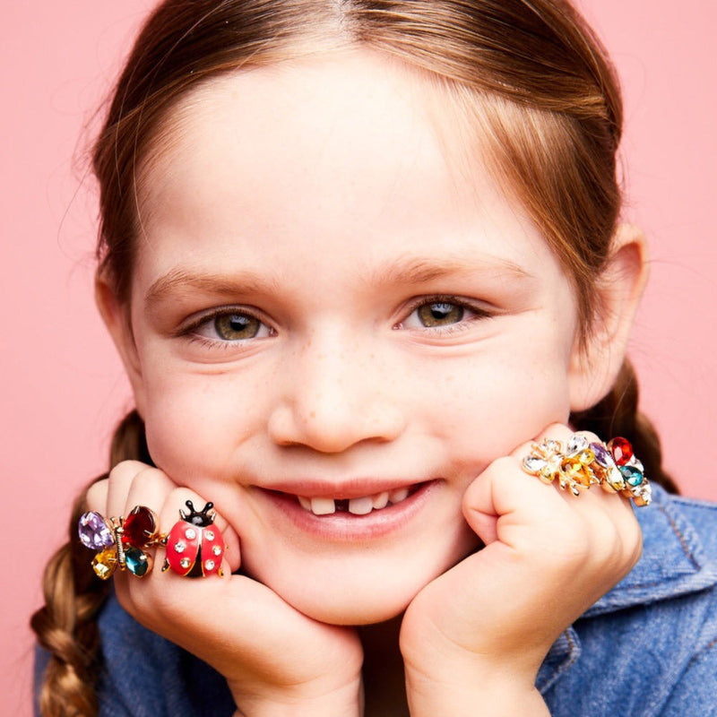 Buzz, buzz, the outdoors are calling your name! Whether you’re the “get your hands dirty” type or the kid who prefers a twinkle-lit garden tea party, these rings are for you! This set of 5 (!) vibrant rings features your favourite gem-covered friends: 2 butterflies, a bee, a ladybug, and a flower—perfect for celebrating your adventurous spirit AND your sparkle obsession.