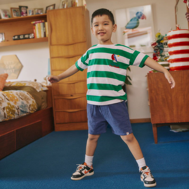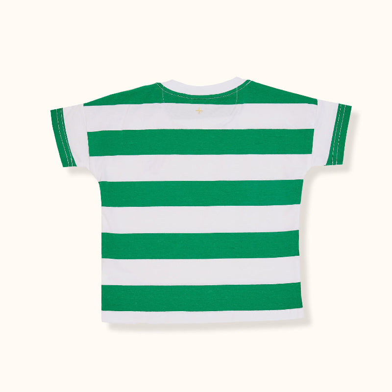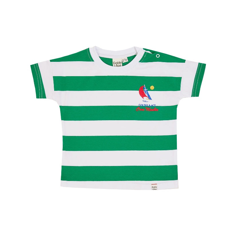 Yarn Dye Stripe Jersey Tee with embroidered Goldie + Ace crew member logo.
