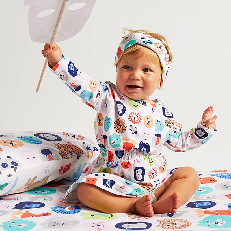 Say hello to our Pet Portraits print! In this family, we've got fluffy, spiky, scaly and furry creatures all giving us big smiles, and sometimes a roar, ooh-ah-ah or meow! Pet Portraits explores babies interest with animals through colours and textures. We learn how these creature comforts get ready for their close-ups and how it's one big happy family here.