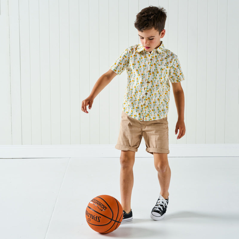Relaxed fit with fabric collar and honey stitching. Fabric front panel and pocket with honey stitching. Dark coconut buttons.