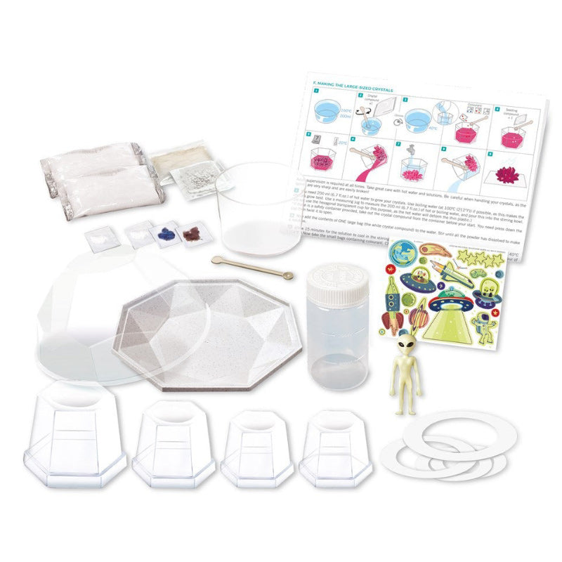 Contents: 1 Alien figurine, 1 sheet of glow stickers, 1 bag of gravel, 1 bag of sand, 2 white crystal compounds, 3 colourants, 1 white seeding compound, 1 stirring bowl & spoon, transparent growing cups (1 large, 1 medium & 2 small) 1 terrarium tray with cover, ring-shaped templates & detailed instructions.