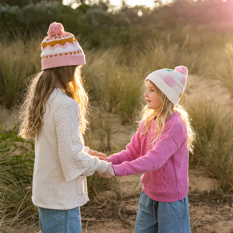 A gorgeous beanie with a graphic knit pattern that is classic with a modern twist.