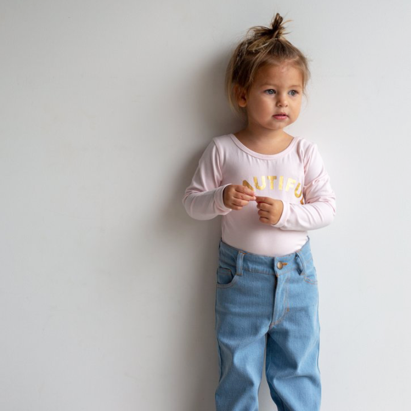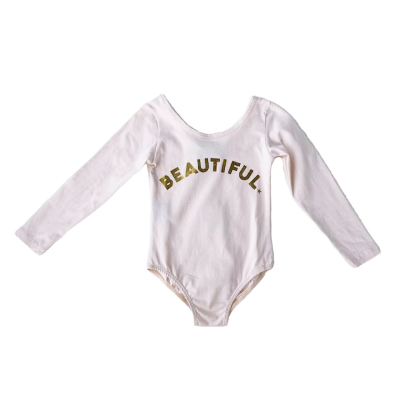 A classic leotard with a ’beautiful’ logo in gold foil print across the chest. Snap Crotch on all sizes