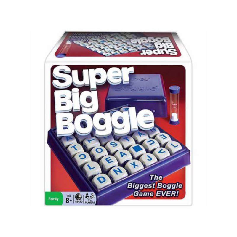 Big Boggle has a super-sized 6x6 grid including the new double letter cube and new blank cube. Includes 36 letter cubes and a 4 minute timer provide a fresh challenge with every game. The biggest boggle game ever.