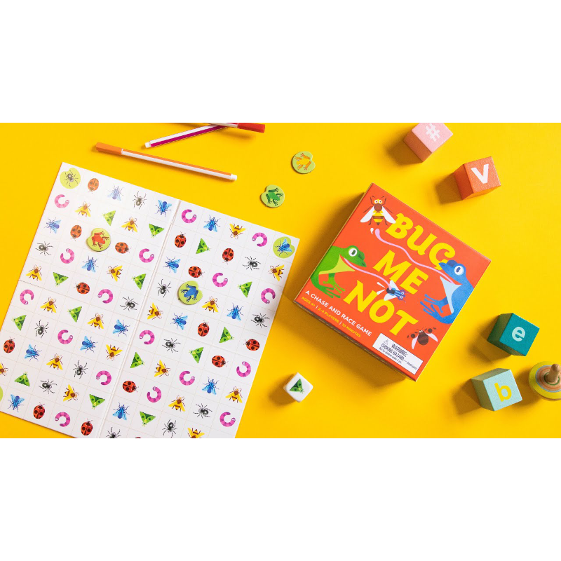 FUN FOR THE WHOLE FAMILY. Simple game play makes Bug Me Not! suitable for children aged 4+. Be the first to get your frog from one corner of the board to the opposite corner, feasting on insects along the way! Pick your frog and roll the bug die. If there is a matching bug on a square next to you, you have to move. If there's no bug, the next player goes. If another player is already on the matching square, tell 'em to bug off and chase 'em home! With a mix of skill and chance Bug Me Not! is fun for the whole family!