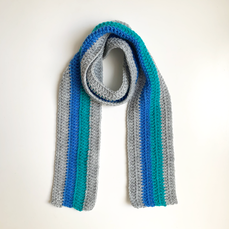 Crochet Scarf - Grey/Teal is backordered and will ship as soon as it is back in stock.