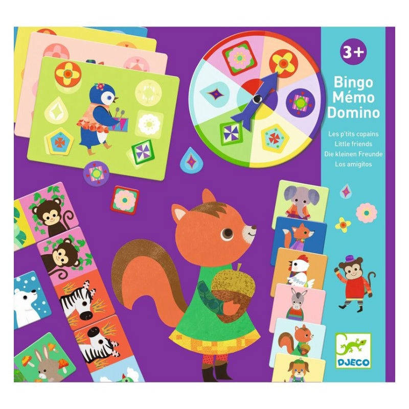 A playful and colourful game set jam-packed set with 3 educational games: bingo, dominoes and a memory game with animal-themed illustrations.