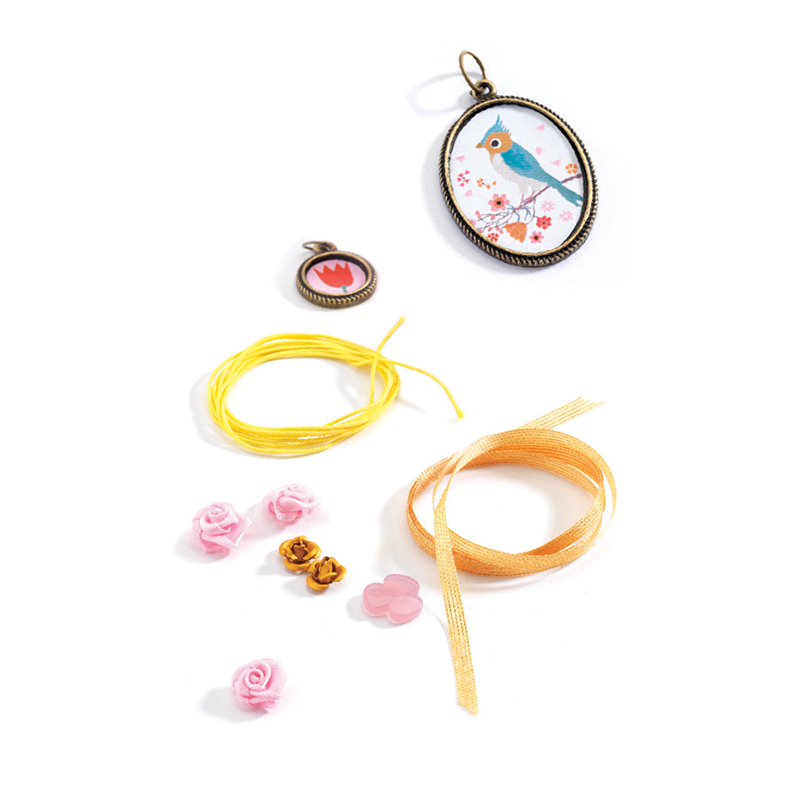 Contents: 4 boxes of pearls, 5 coloured ribbons and elastics, 3 illustrated lockets, assorted accessories, and an illustrated booklet.