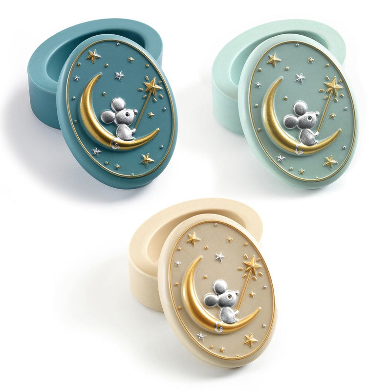 A tooth box illustrated with a sweet little 3D scene, available in 3 different shades (light turquoise, dark turquoise and cream) with shimmering colours (gold finish). This box will be the perfect addition to your child's bedroom.