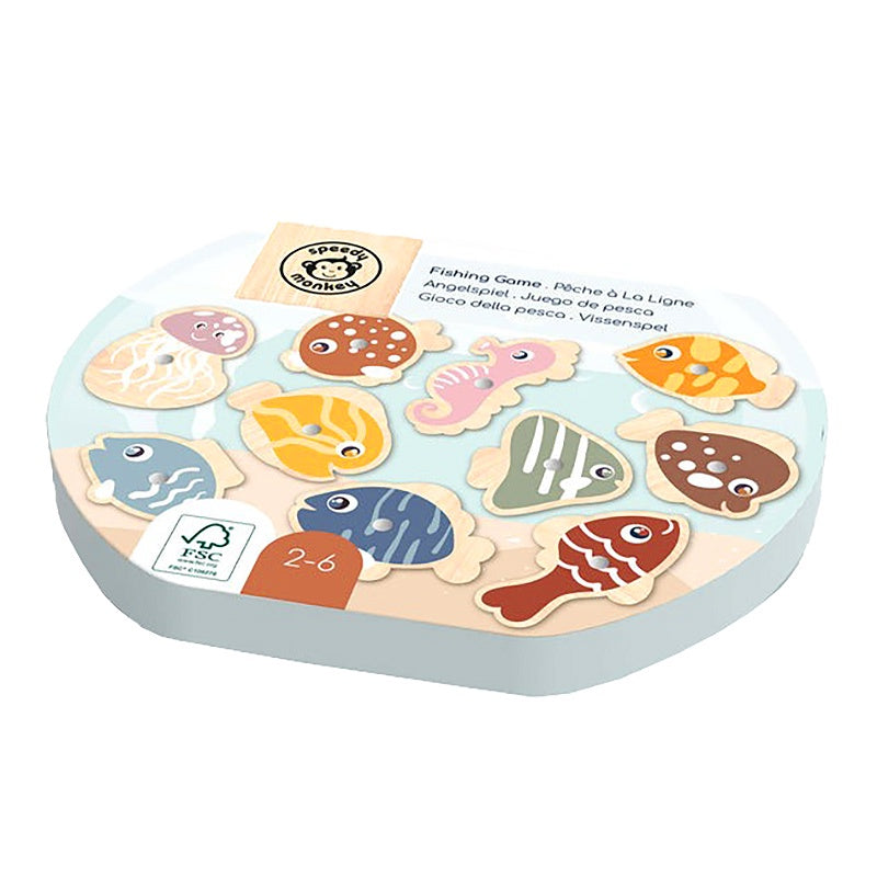 Time to go fishing? Grab your fishing rod for a fun time! These colourful wooden fish can be hooked up by the magnetic wooden rod and once safely attached, lowered back onto the board. Requiring skill and concentration to catch each fish. This Helps to develop dexterity and co-ordination. This toy is crafted from sustainably sourced wood from FSC® certified forests and coated with non toxic paint.