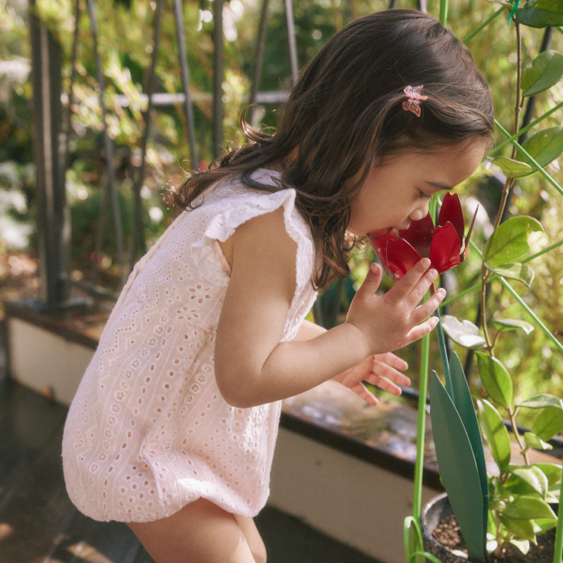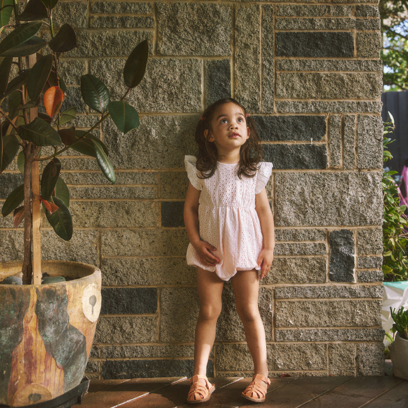 The Lani Romper is the perfect lightweight summer romper. Featuring sweet ruffle sleeves, made from a soft, vintage washed lightweight cotton made from Broderie Anglaise. Snap closure down back neck and under the gusset for easy changing.