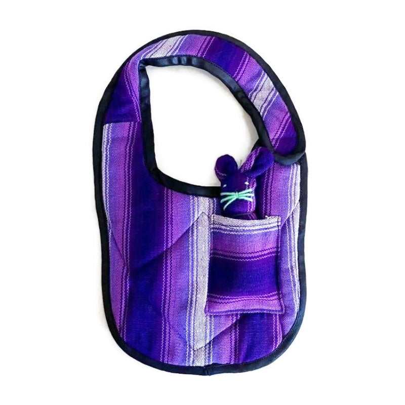 A gorgeous handwoven Bib with a Toy. Made in Guatemala.