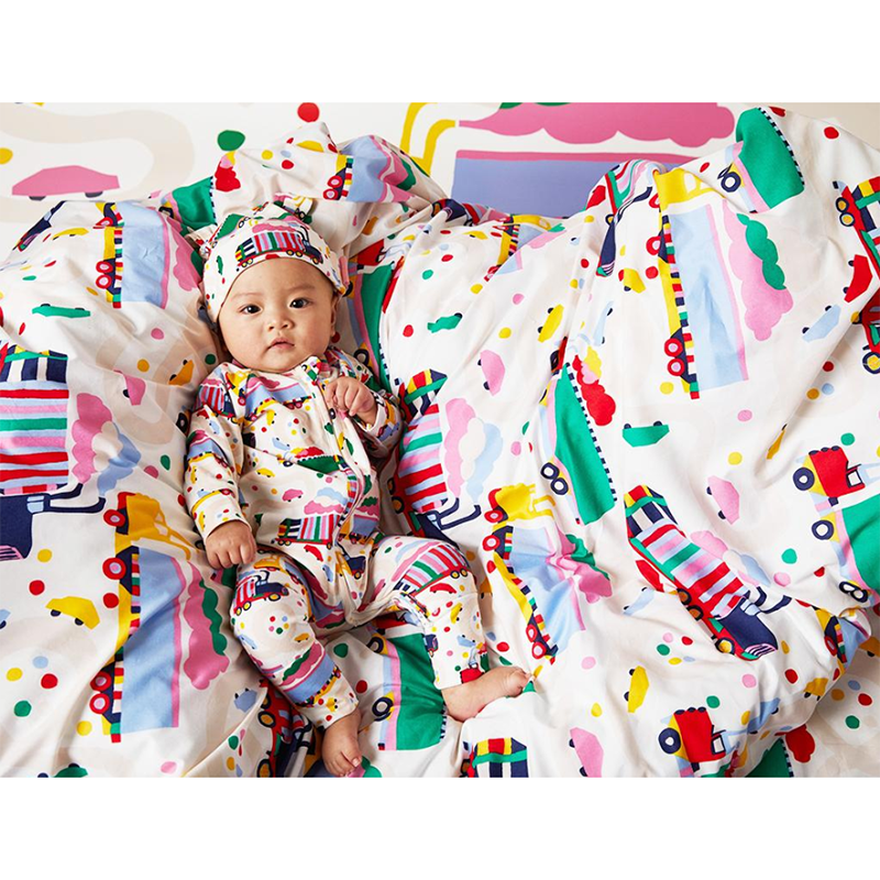 Who said trucks are for boys?! Not Halcyon Nights, trucks are definitely fun for everyone! Hand painted by Swedish artist, Monika Foresberg, the new lorries print is a collaboration that really encompasses the halcyon belief of gender neutral clothing and bedding. The bright yellows, roaring reds and pastel pinks will also be available to brighten the bedroom. Toot-Toot!