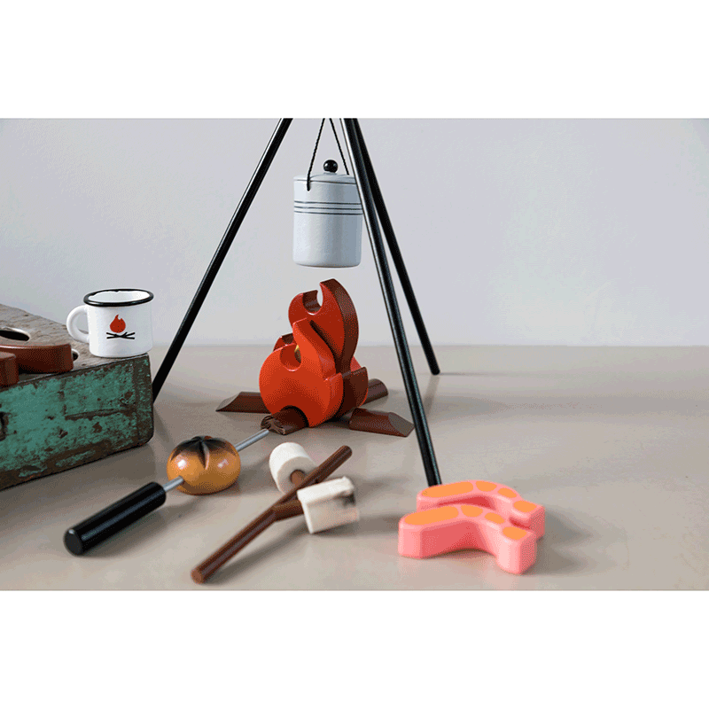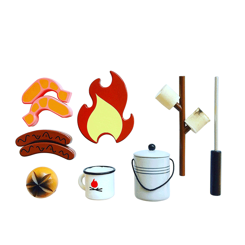 Complete with 1 Camp Fire (with 3 Red Flames and Timber Base), Cooking Stick, Damper, 2 x Prawns, 2 x Sausages, Branch-shaped Marshmallow Stick, 2 x Marshmallows, Tea-Cup, Tripod (with detachable legs) and a Billy Can for pretend play.