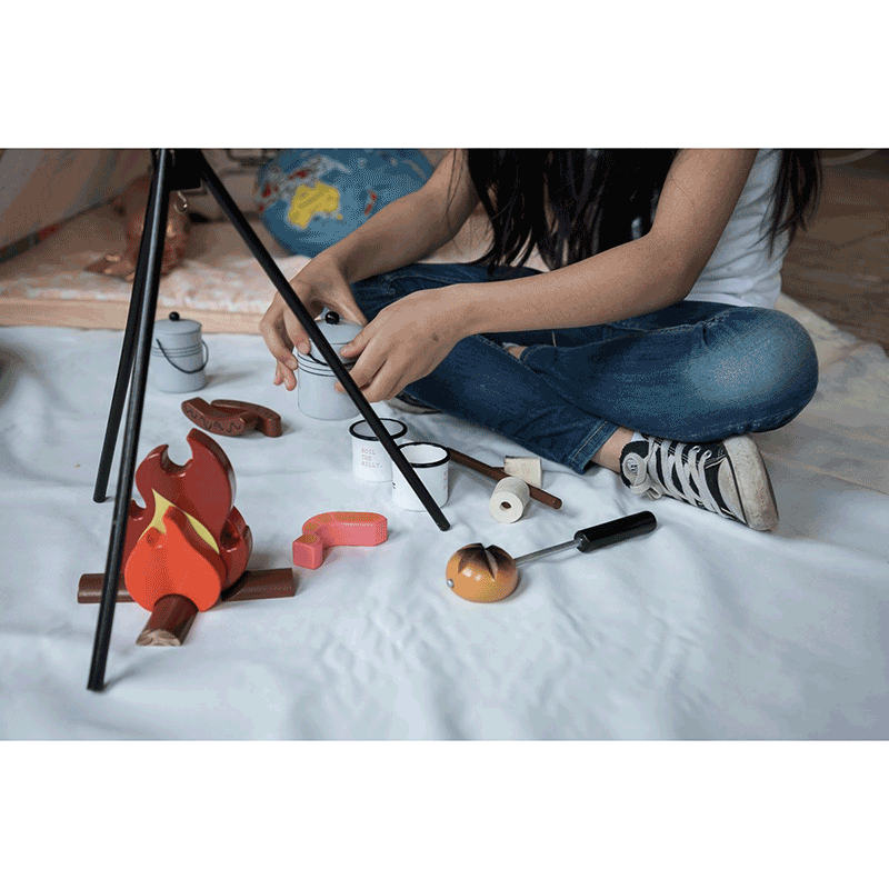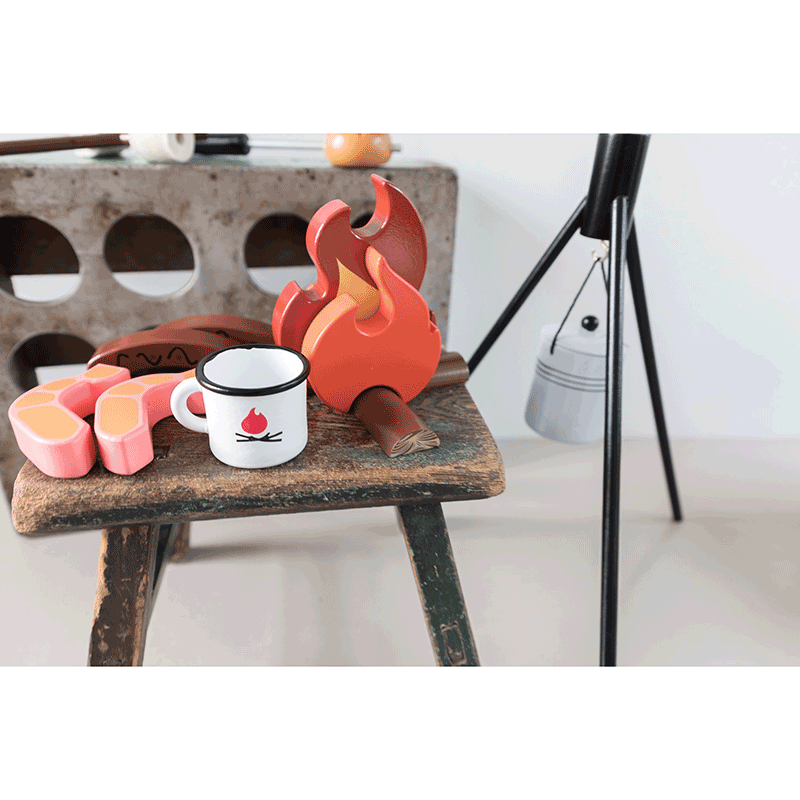 We love to have pretend fun around a campfire and this camping set has all of the perfect accessories to make these memories! This Aussie Camp Fire comes complete with tripod to hold the Billy Can and sits flawlessly above the flames & logs. Roast some felt marshmallows using your camp fire stick or try cooking a prawn and sausage.