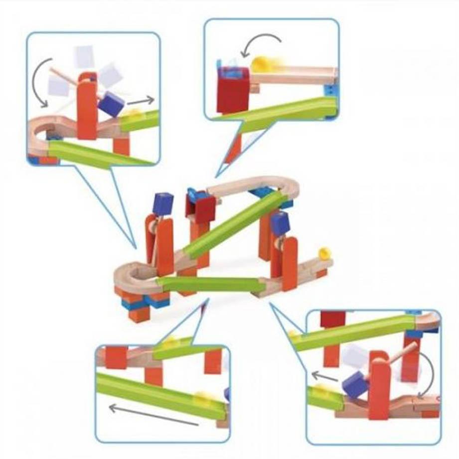 Starts from the bottom, pound the ball up the track for it to go another power station - it goes against gravity!. This is a wooden ball and track set using brick locking system for stability. Swing the hammer backwards to hit the ball up the tracks.