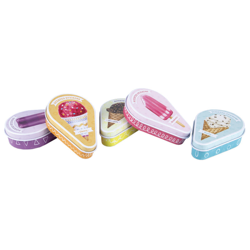 The cute and colourful designs come in a reusable, collectable ice-cream shaped tin and includes 20 stickers in each.